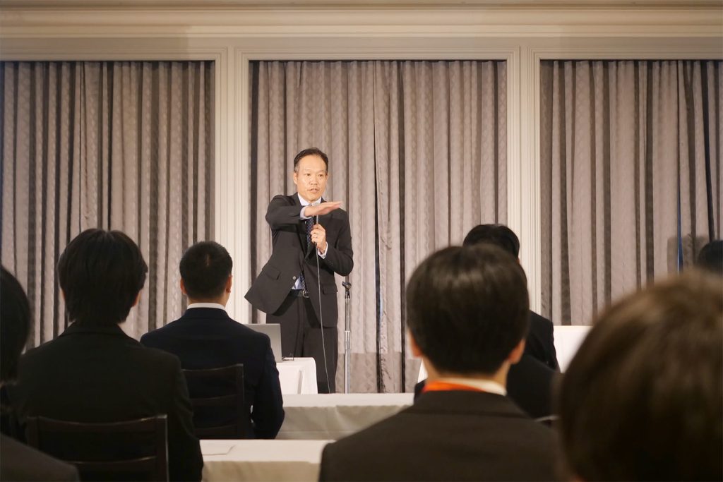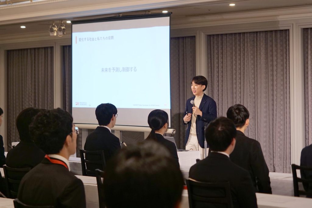 代表挨拶で中山は、変化の激しい時代でも変わらずに対処できる能力として「過去をよく学び、現状を分析し、未来を予測して制御する」ことをお話ししました。そして、私たちの提供するデジタルソリューション事業は、最先端のデジタル技術で、未来を予測して制御する、未来を作る仕事であり、その仲間に皆さんが加わってくれることを楽しみにしていますとメッセージを送りました。