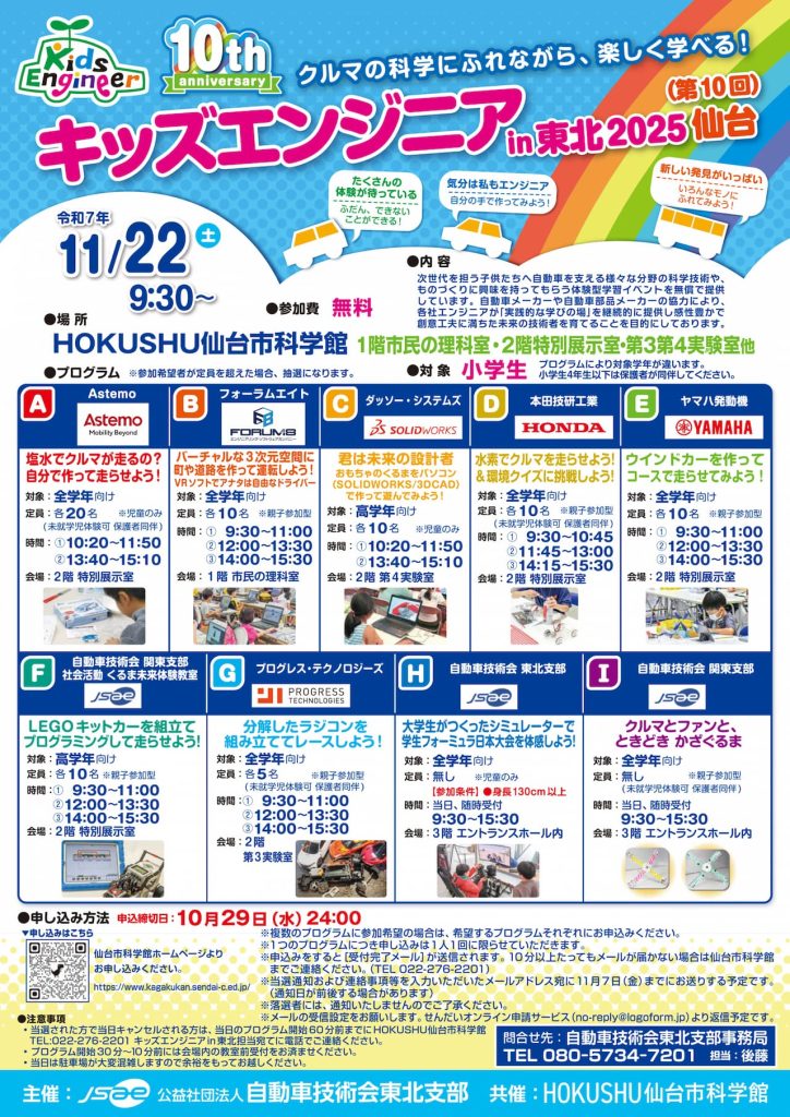 自動車技術会(自技会)が開催する「キッズエンジニアin東北 2025 仙台」に、今年もプログラム参加します。